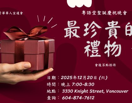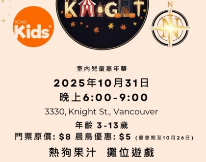 6 時 – 9 時2025年10月31日溫哥華華人宣道會 Fun Knight 是孩子們的嘉年華會, 每年於10月31日晚舉行 : 提供遊戲,獎品,零食和禮品包。好玩又安全去替代鬼王節。門票會在星期日上午11:00至11:30和下午12:30至1:00在大堂外出售 主題 : True North True Light當日票價 : $8.00晨鳥票價 : $5.00 (直到10月26日)