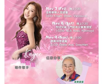 2025年11月7日(星期五), 晚上7:30 美麗傳奇-ETERNITY "美麗傳奇-陪著你走音樂佈道之旅" 唱作歌手: 譚嘉儀 (Kayee) 信息分享: 喜樂婆婆 - 小金子
